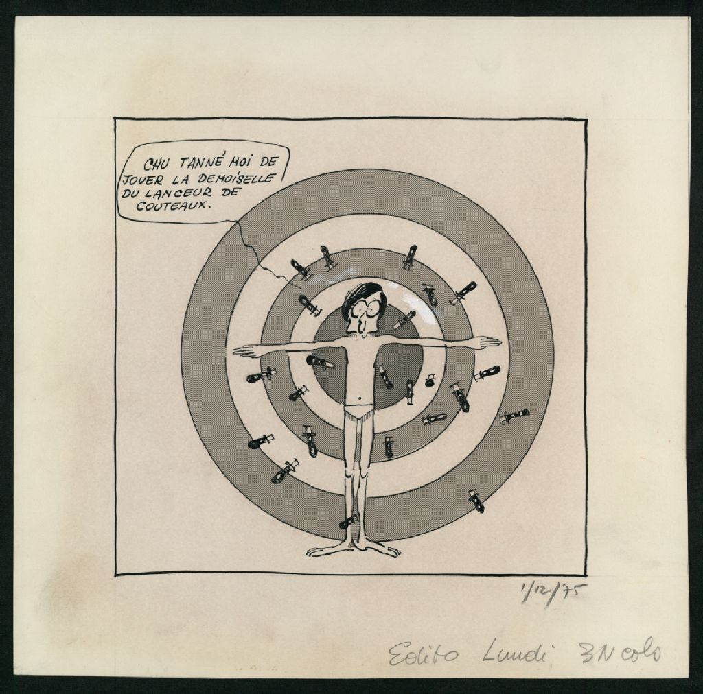 Robert Bourassa en demoiselle de lanceur de couteaux, 1 décembre 1975, Archives nationales à Montréal, Fonds Jean-Pierre Girerd, (06M,P683,S2,SS2,P266), Girerd.