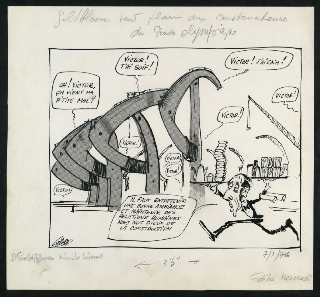 Victor Goldbloom veut plaire aux constructeurs du Stade olympique, 7 janvier 1976, Archives nationales à Montréal, Fonds Jean-Pierre Girerd, (06M,P683,S2,SS2,P273), Girerd.