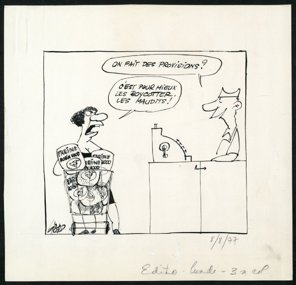 Cette pièce montre une femme à l'épicerie achetant plusieurs sacs de farine Robin Hood pour faire un boycott
