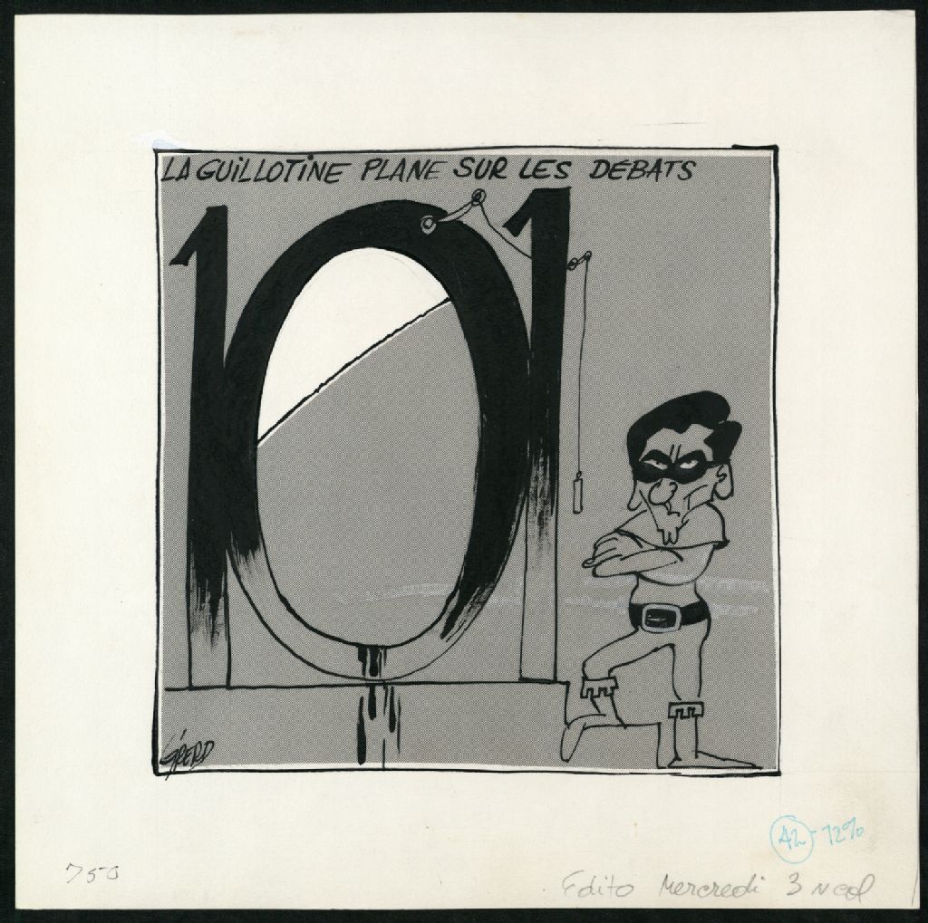 La guillotine plane sur les débats, 10 août 1977, Archives nationales à Montréal, Fonds Jean-Pierre Girerd, (06M,P683,S2,SS2,P375), Girerd.