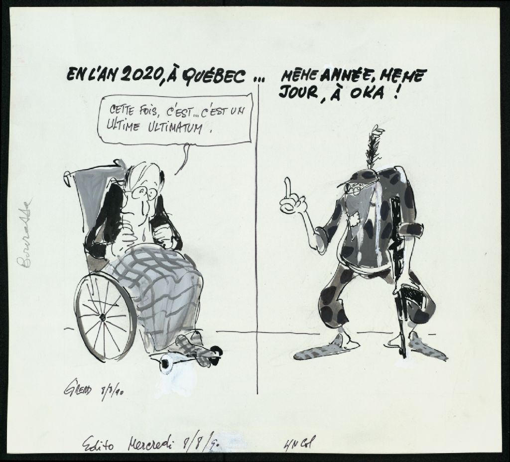 En l'an 2020, à Québec ... même année, même jour, à Oka, 8 août 1990, Archives nationales à Montréal, Fonds Jean-Pierre Girerd, (06M,P683,S2,SS2,P711), Girerd.
