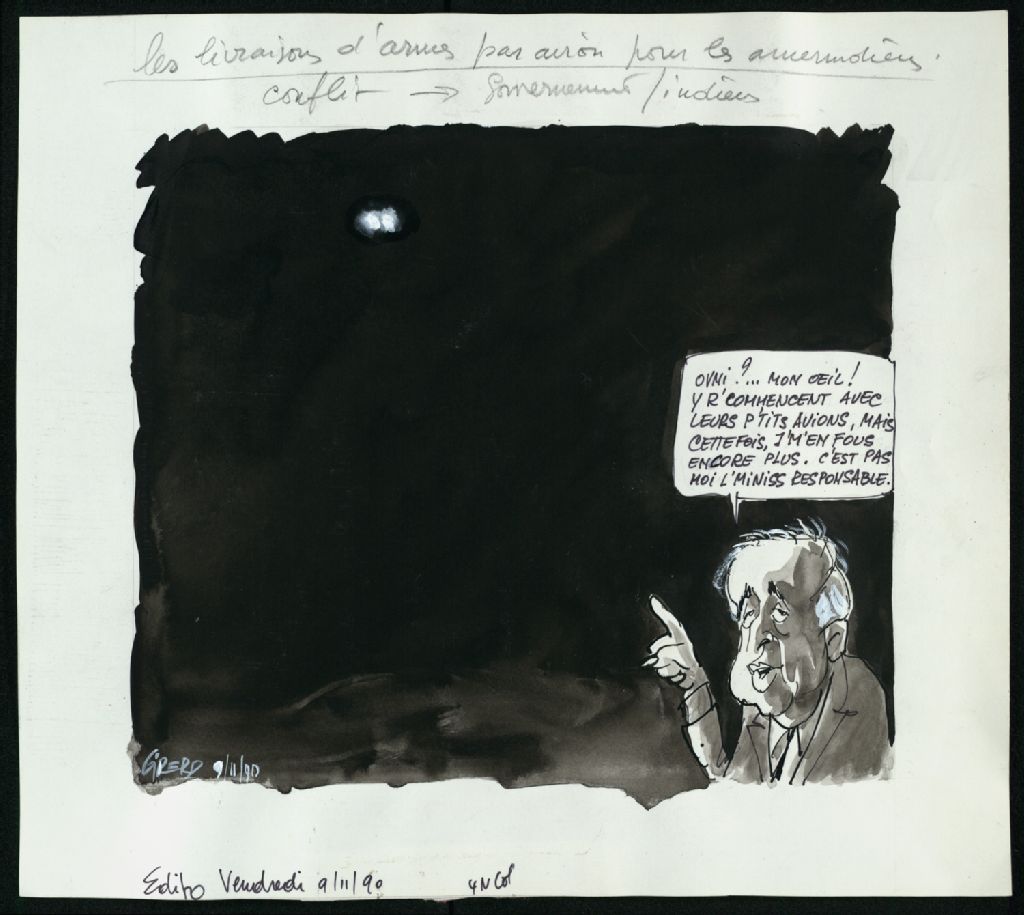 Ovni? ... Mon oeil! Y r'commencent avec leurs p'tits avions, mais cette fois, j'm'en fous encore plus. C'est pas moi l'miniss responsable, 9 septembre 1990, Archives nationales à Montréal, Fonds Jean-Pierre Girerd, (06M,P683,S2,SS2,P734), Girerd.