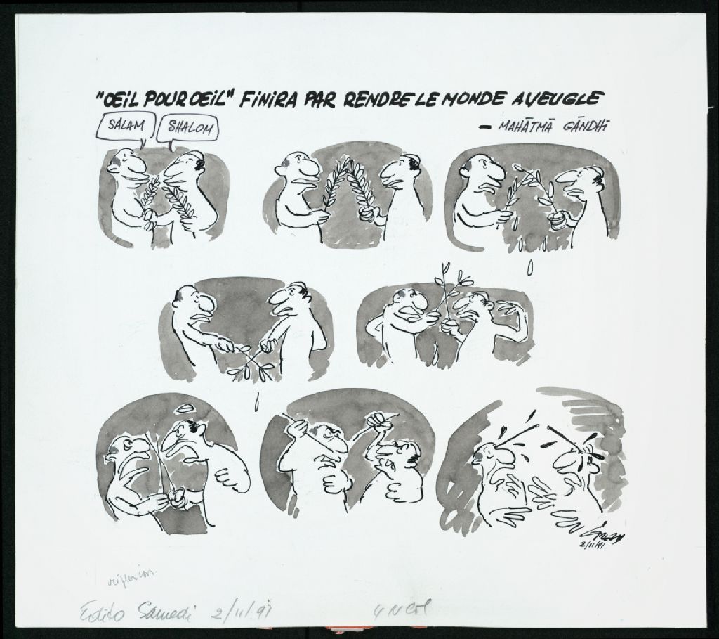 "Oeil pour oeil" finira par rendre le monde aveugle - Mahatma Gandhi, 2 novembre 1991, Archives nationales à Montréal, Fonds Jean-Pierre Girerd, (06M,P683,S2,SS2,P743), Girerd.