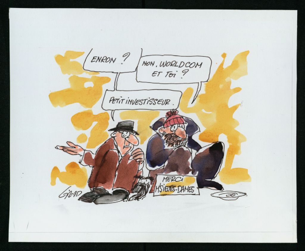 Cette pièce montre deux hommes devenus mendiants à la suite de la faillite d'Enron et de WorldCom