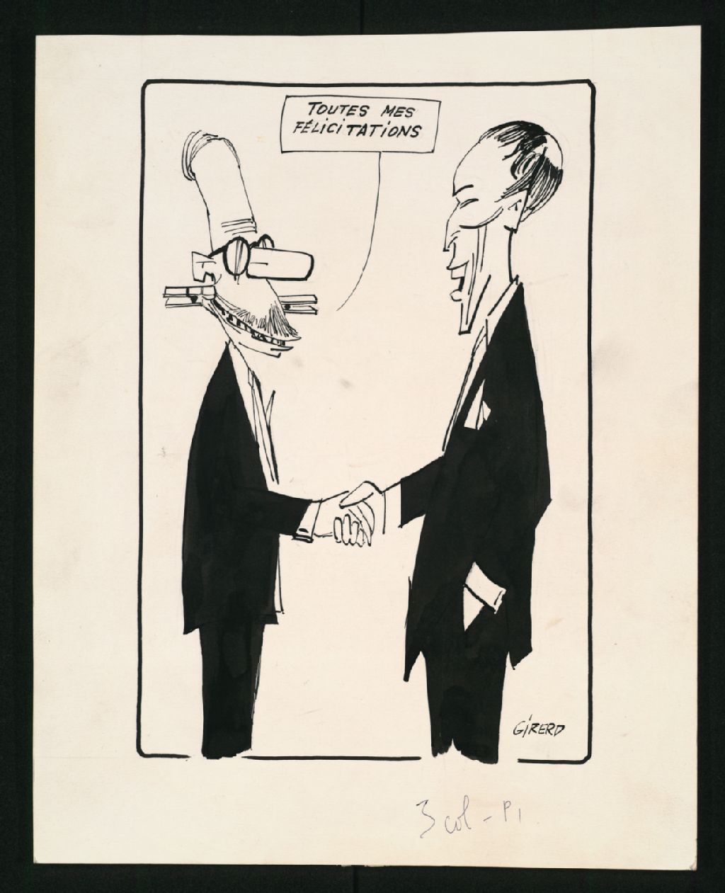 Daniel Johson père félicite Pierre-Elliott Trudeau, un sourire forcé au visage