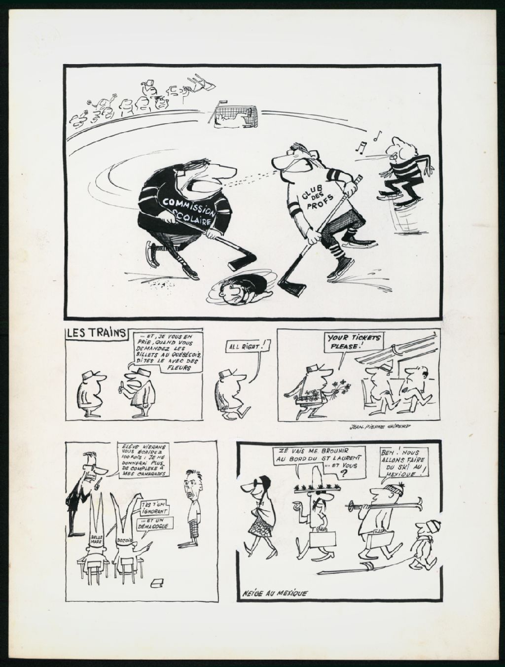 Cette pièce montre, dans la partie du haut, une joute de hockey entre une équipe de la commission scolaire et des professeurs qui se servent d'un élève comme rondelle; dans la partie centrale, un contrôleur de train anglophone s'adresse à des passagers québécois avec des fleurs; dans la partie inférieure gauche, Eric Kierans se fait réprimander par un professeur pour avoir donné des complexes à Maurice Bellemare et Paul Dozois; dans la partie inférieure droite, des touristes mexicains arrivent au Québec alors que des touristes québécois partent pour le Mexique