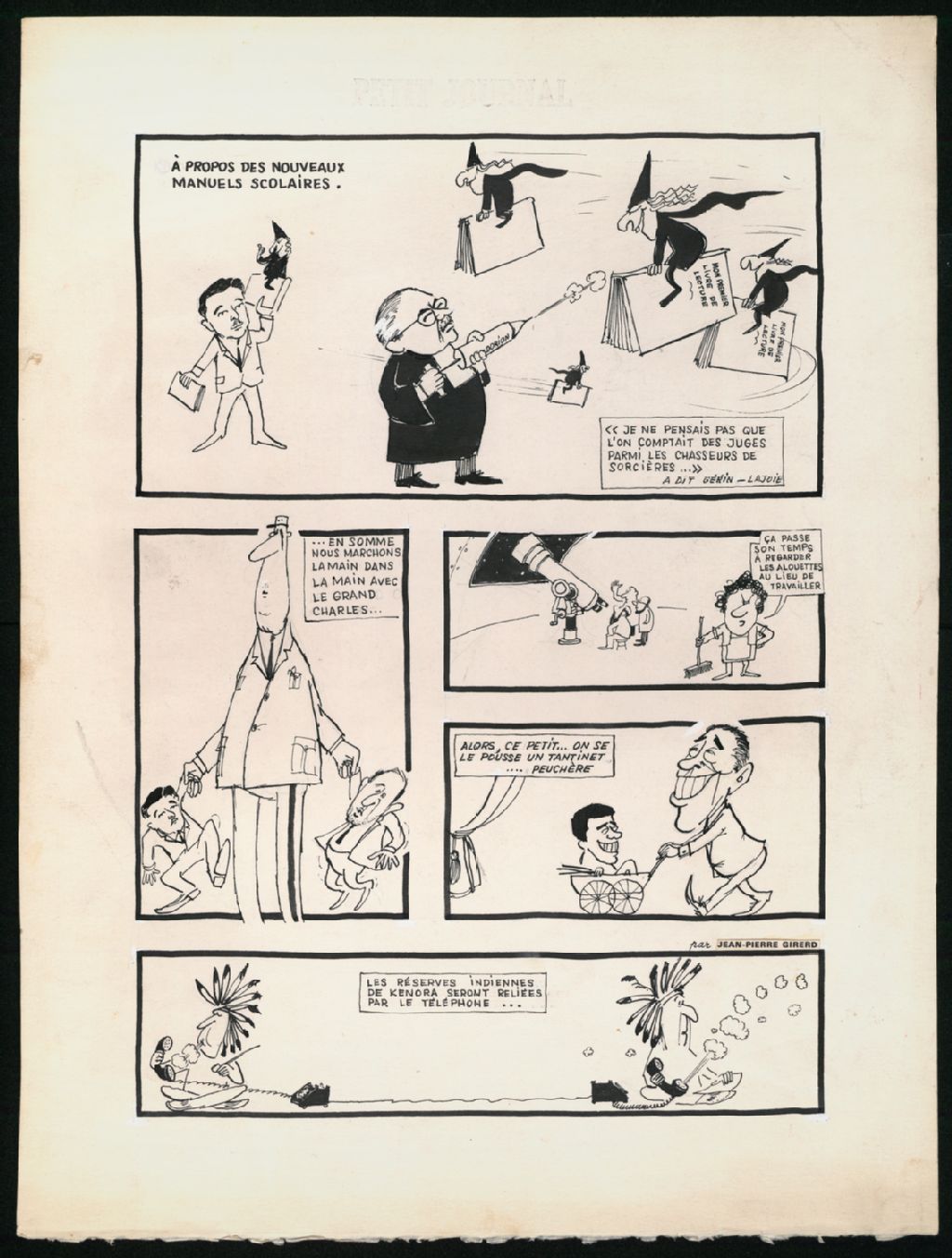 Cette pièce parue dans le Petit Journal montre, dans la partie supérieure, Paul Gérin-Lajoie qui chasse des sorcières qui chevauchent des manuels scolaires; dans la partie centrale gauche, Charles de Gaulle tient par la main deux parlementaires, dont Paul Gérin-Lajoie; dans la partie centrale droite, des scientifiques observent le satellite Alouette 1, une femme confond ce dernier avec l'équipe de football les Alouettes de Montréal; dans la partie inférieure, des Indiens de Kenora utilisent le téléphone pour envoyer des signaux de fumée