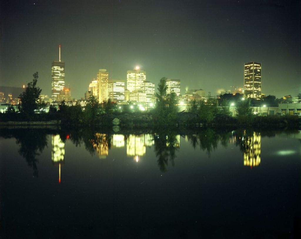 Les gratte-ciel de Montréal vus du canal Lachine, de nuit