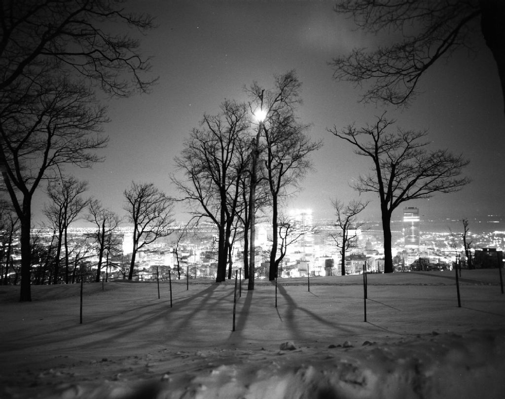 Le dossier présente une vue panoramique de Montréal à partir d'un des sentiers du mont Royal. Nous apercevons, entre les arbres à l'avant-plan, les principaux immeubles et gratte-ciel de la ville scintillant dans la nuit
