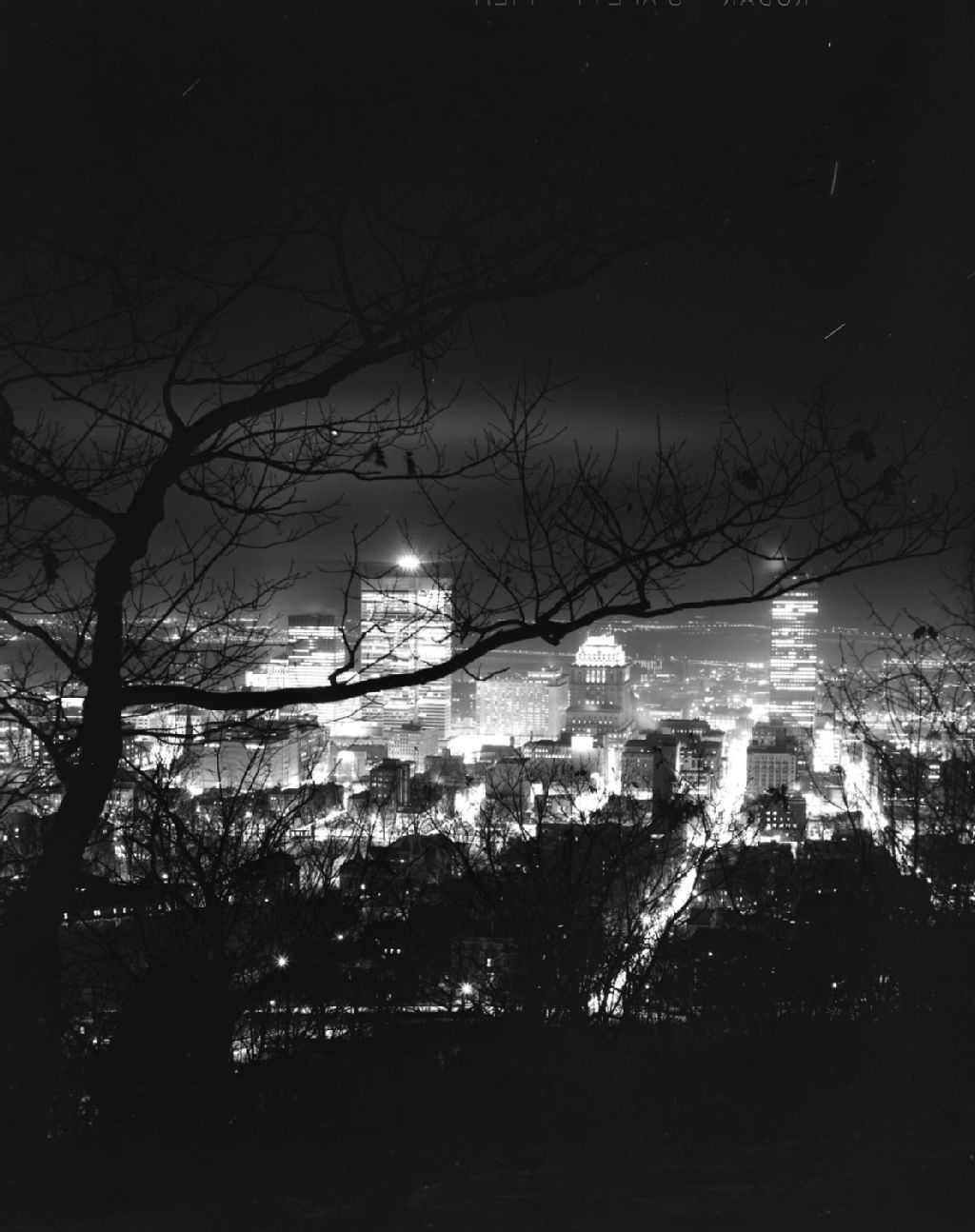 - Le dossier présente le centre-ville de Montréal à partir du sommet du mont Royal. Nous apercevons à travers les branches les principaux immeubles et gratte-ciel montréalais, dont la Place Ville-Marie illuminant la ville de son gyrophare