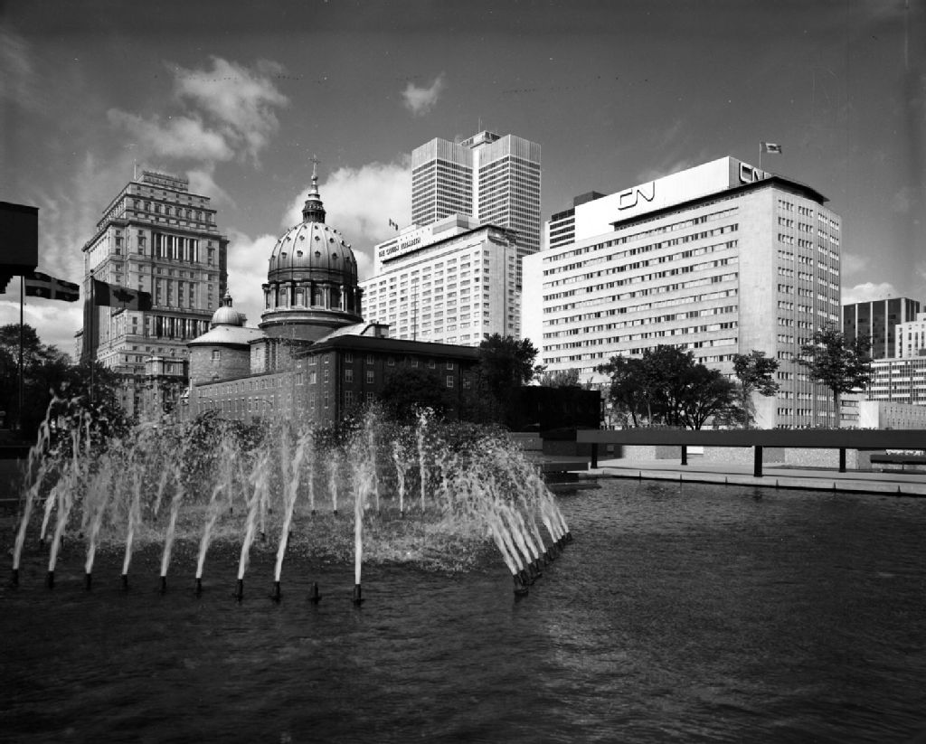 - Le dossier présente différentes vues du centre-ville de Montréal, de jour comme de soir, dont certaines réalisées à partir du mont Royal. Nous retrouvons, entre autres, l'édifice de la Sun Life, la cathédrale Marie-Reine-du-Monde, l'hôtel The Queen-Elizabeth, la Gare Centrale et la Place Ville-Marie. Deux photographies (# 6 et #7) représentant la Place de l'Hôtel de ville de Trois-Rivières font également partie de ce dossier