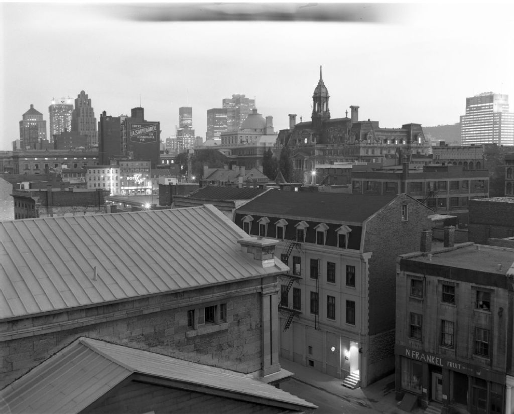 - Nous remarquons l'édifice de la banque Royale, la place Victoria en construction, l'édifice Alfred, le bâtiment La Sauvegarde, la place Ville-Marie, l'hôtel de ville de Montréal, le bâtiment Hydro Québec