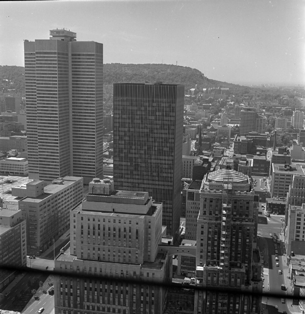 - Ce dossier porte sur l'aménagement et la construction de la tour de la place Victoria, devenue par la suite la tour de la Bourse, située au square Victoria à Montréal. Le dossier contient des vues des ouvriers à l'oeuvre sur le chantier de construction, des vues en contre-plongée de la tour ainsi que des vues en hauteur du centre-ville de Montréal. Parmi les immeubles se trouvent l'hôtel Laurentien, la gare Windsor devenue la gare Centrale, l'hôtel Le Reine-Elizabeth, la place Ville-Marie, l'édifice Hydro-Québec. Dans le quartier des affaires, aux environs de la rue Saint-Jacques, nous remarquons la Banque Royale, l'édifice du Montreal Star et celui de la Banque de Montréal