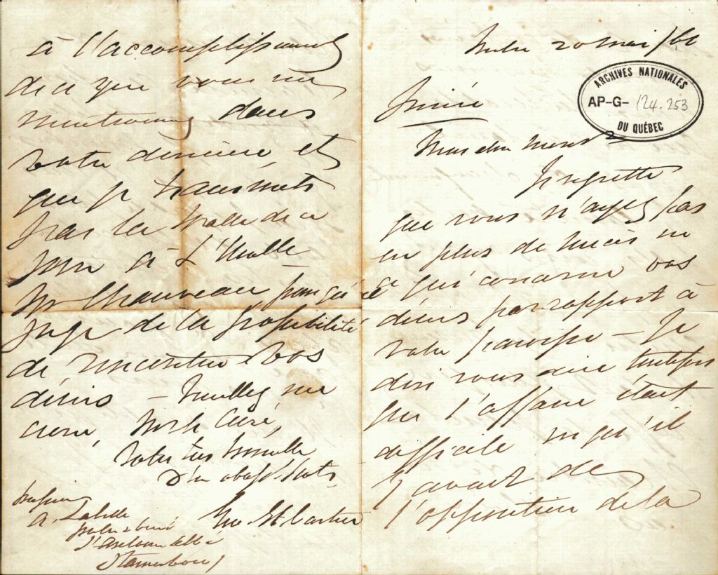 Correspondance de Georges-Etienne Cartier à monseigneur Antoine Labelle, 20 mai 1860-15 septembre 1869, Archives nationales à Montréal, Fonds Antoine Labelle, (06M,P774,S1,D103).