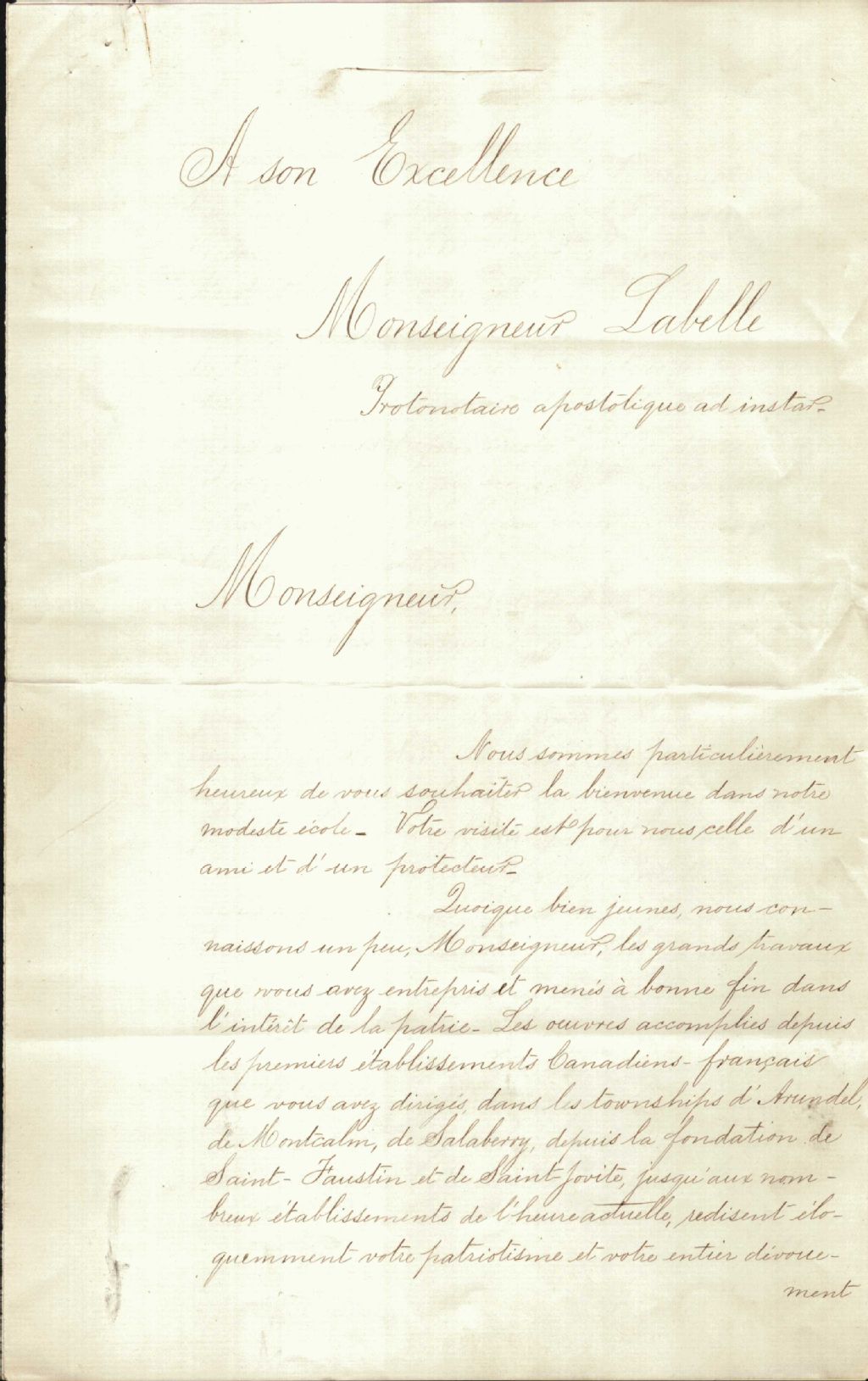 Lettre de bienvenue de l'École d'Agriculture de Sainte-Anne de la Pocatière à monseigneur Antoine Labelle