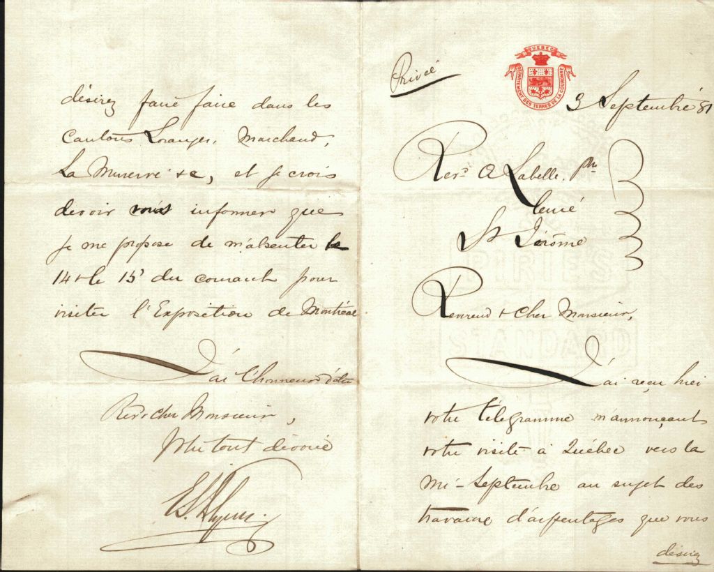 Lettre de E. J. Flynn, commissaire des Terres de la Couronne, au révérend Antoine Labelle, 3 septembre 1881, Archives nationales à Montréal, Fonds Antoine Labelle, (06M,P774,S1,D224).