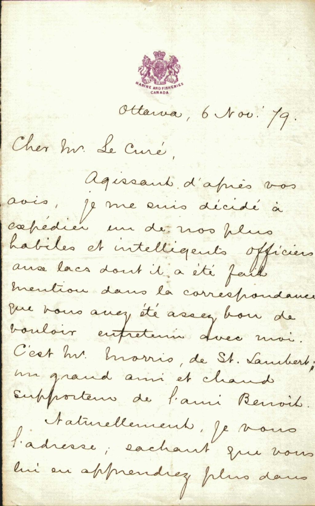 Correspondance de S. P. Bauset, du ministère de la Marine et des Pêcheries du Canada, au révérend Antoine Labelle, 6 novembre 1879, Archives nationales à Montréal, Fonds Antoine Labelle, (06M,P774,S1,D31).