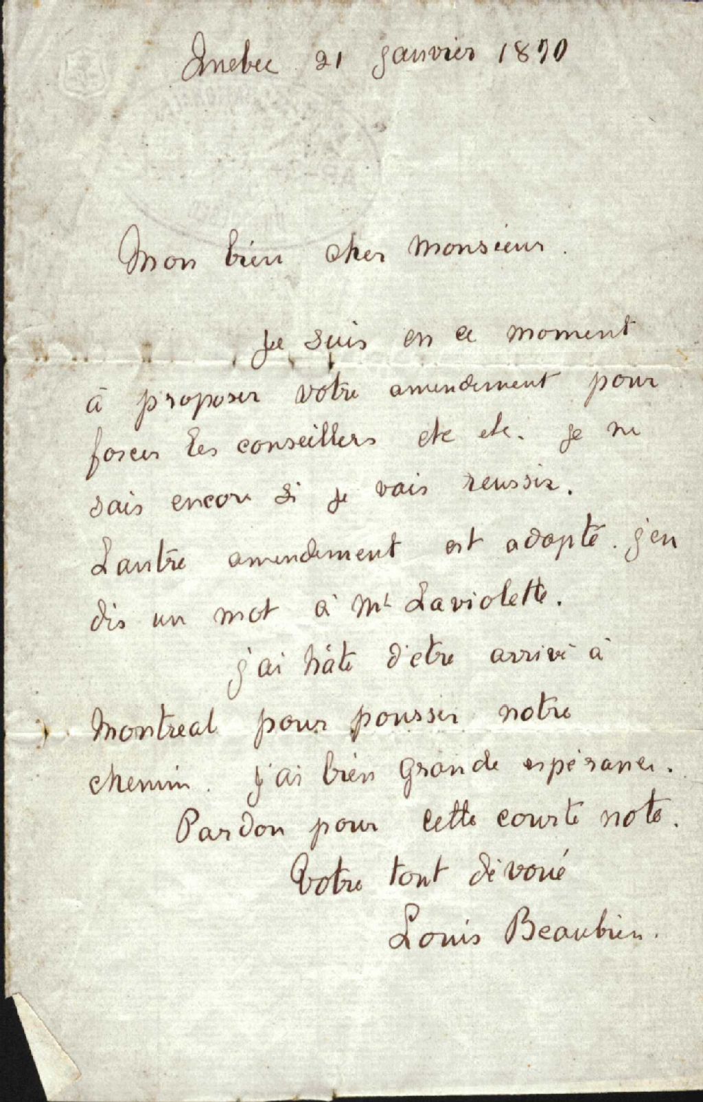 Correspondance entre Louis Beaubien et le révérend Antoine Labelle