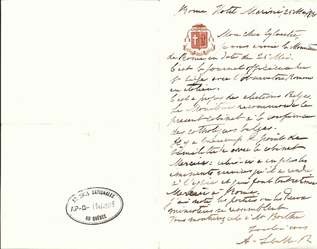 Correspondance de monseigneur Antoine Labelle, 25 mai 1870-[189-], Archives nationales à Montréal, Fonds Antoine Labelle, (06M,P774,S1,D322).