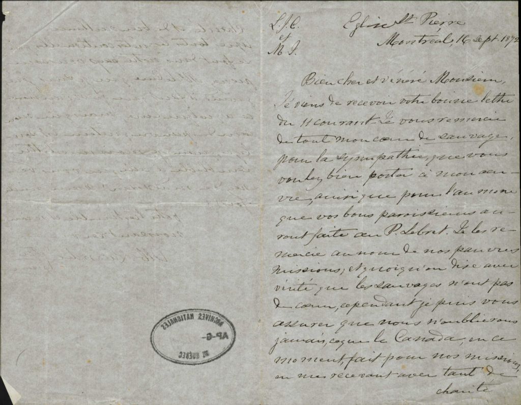Lettre du révérend Albert Lacombe, o.m.i., au révérend Antoine Labelle, 16 septembre 1872, Archives nationales à Montréal, Fonds Antoine Labelle, (06M,P774,S1,D334).