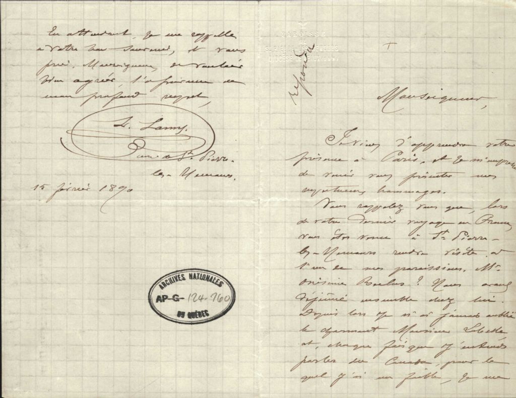 Lettre du révérend L. Lamy à monseigneur Antoine Labelle, 15 février 1890, Archives nationales à Montréal, Fonds Antoine Labelle, (06M,P774,S1,D341).