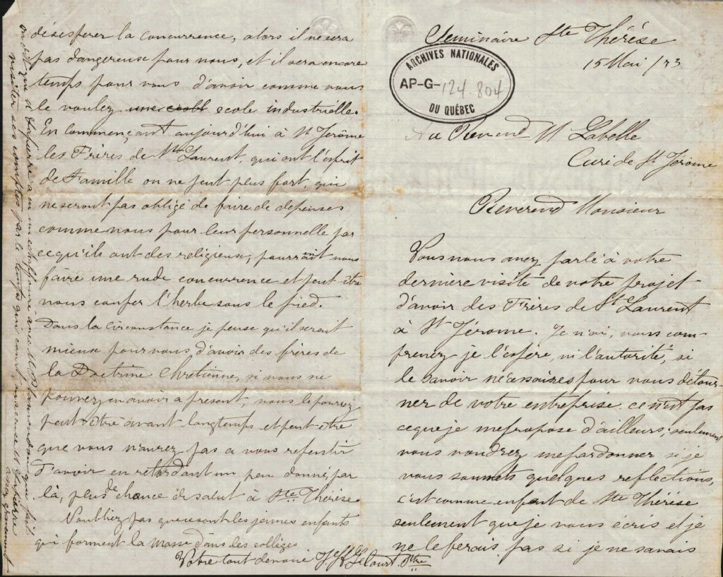 Lettre du révérend M. H. Lecourt au révérend Antoine Labelle, 15 mai 1873, Archives nationales à Montréal, Fonds Antoine Labelle, (06M,P774,S1,D356).