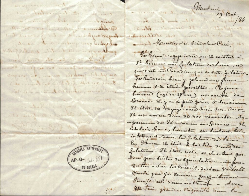 Lettre du révérend H. R. Lenoir au révérend Antoine Labelle, 19 octobre 1884, Archives nationales à Montréal, Fonds Antoine Labelle, (06M,P774,S1,D364).