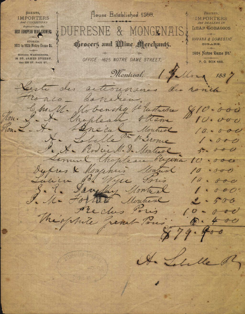 Liste des actionnaires du ranch Franco-Canadien, 17 mars 1887, Archives nationales à Montréal, Fonds Antoine Labelle, (06M,P774,S1,D4).