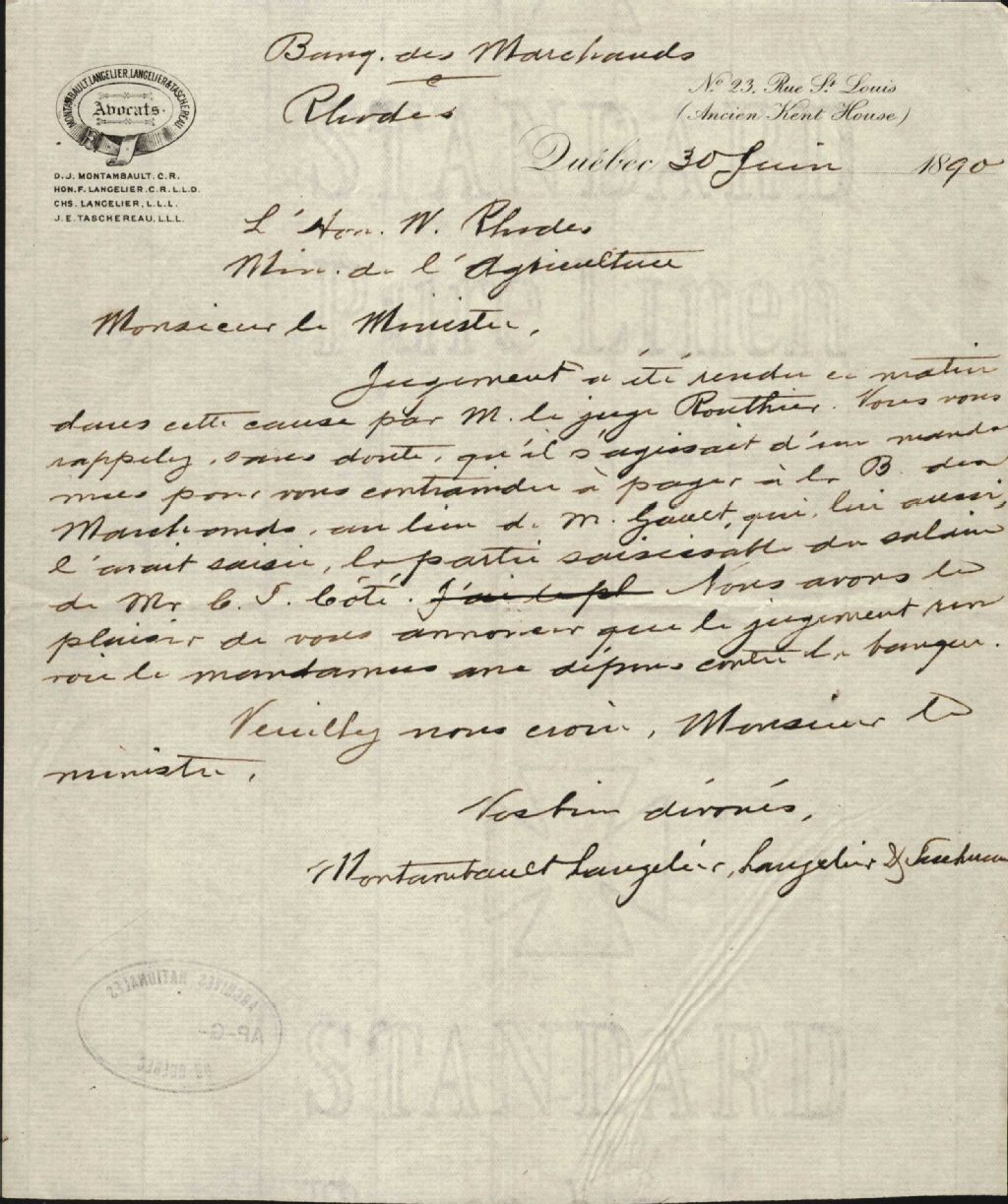 Lettre de Montambault, Langelier, Langelier & Taschereau, avocats, à l'honorable W. Rhodes