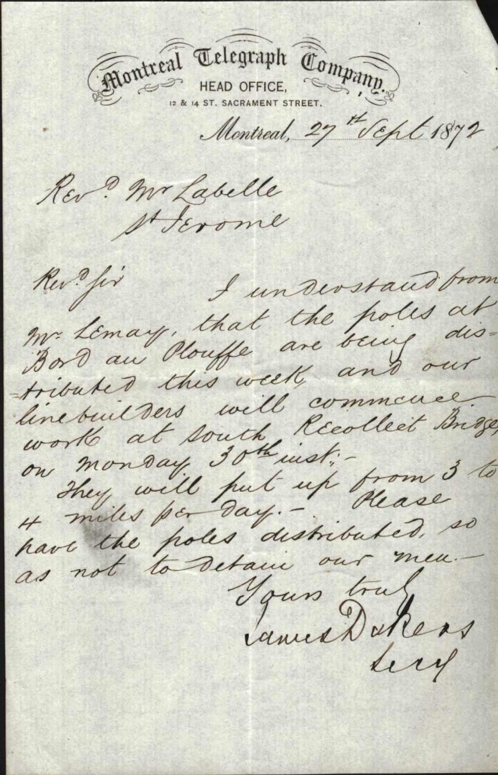 Correspondance de James Darkers, secrétaire, et Chs. Bourne, trésorier, de la Montréal Telegraph Company, au révérend Antoine Labelle, 12 août 1870-27 septembre 1872, Archives nationales à Montréal, Fonds Antoine Labelle, (06M,P774,S1,D431).