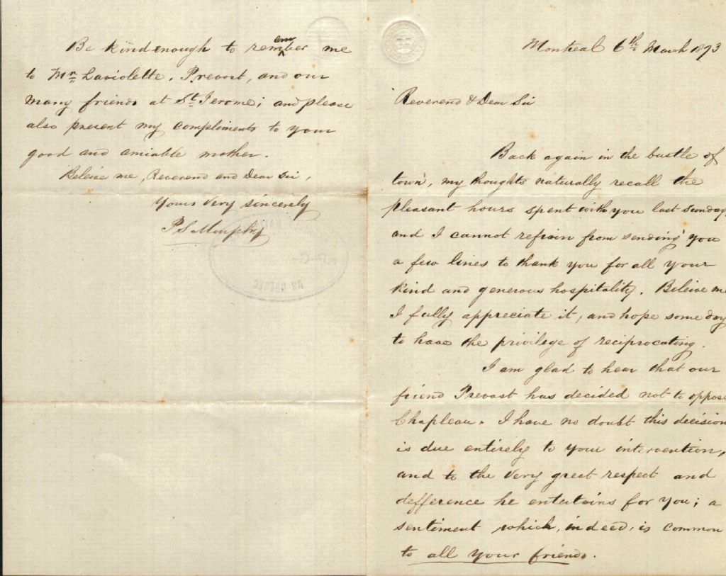Correspondance de P. S. Murphy au révérend Antoine Labelle, 6 mars 1873-1 avril 1875, Archives nationales à Montréal, Fonds Antoine Labelle, (06M,P774,S1,D443).