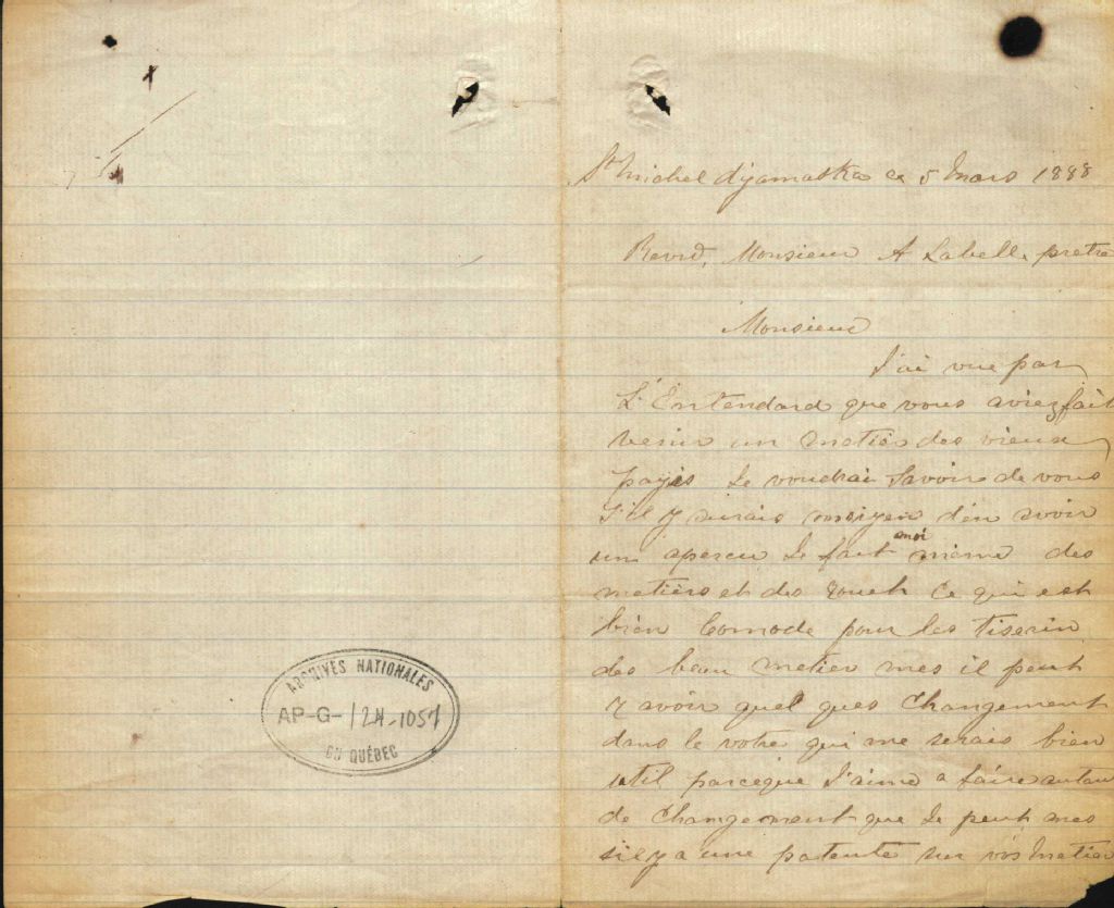 Lettre d'Antoine Paranteau au révérend Antoine Labelle, 5 mars 1888, Archives nationales à Montréal, Fonds Antoine Labelle, (06M,P774,S1,D460).