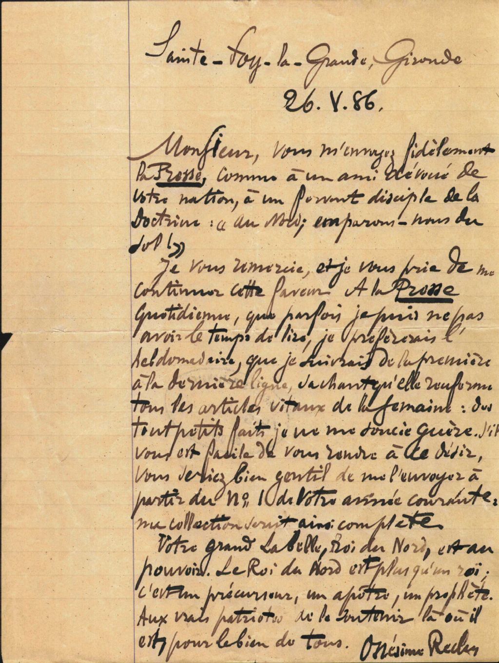 Correspondance d'Onésime Reclus au révérend Antoine Labelle