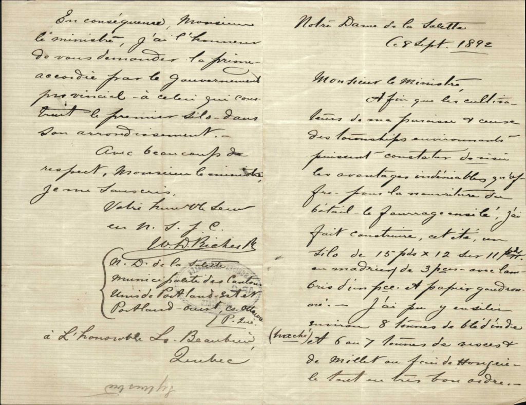 Lettre du révérend W. D. Richer à l'honorable Louis Beaubien