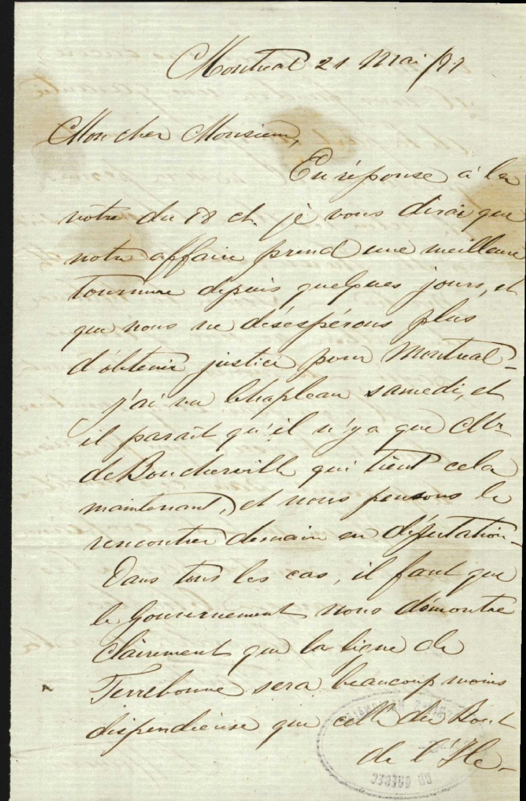 Lettre de S. Rivard au révérend Antoine Labelle, 21 mai 1877, Archives nationales à Montréal, Fonds Antoine Labelle, (06M,P774,S1,D518).