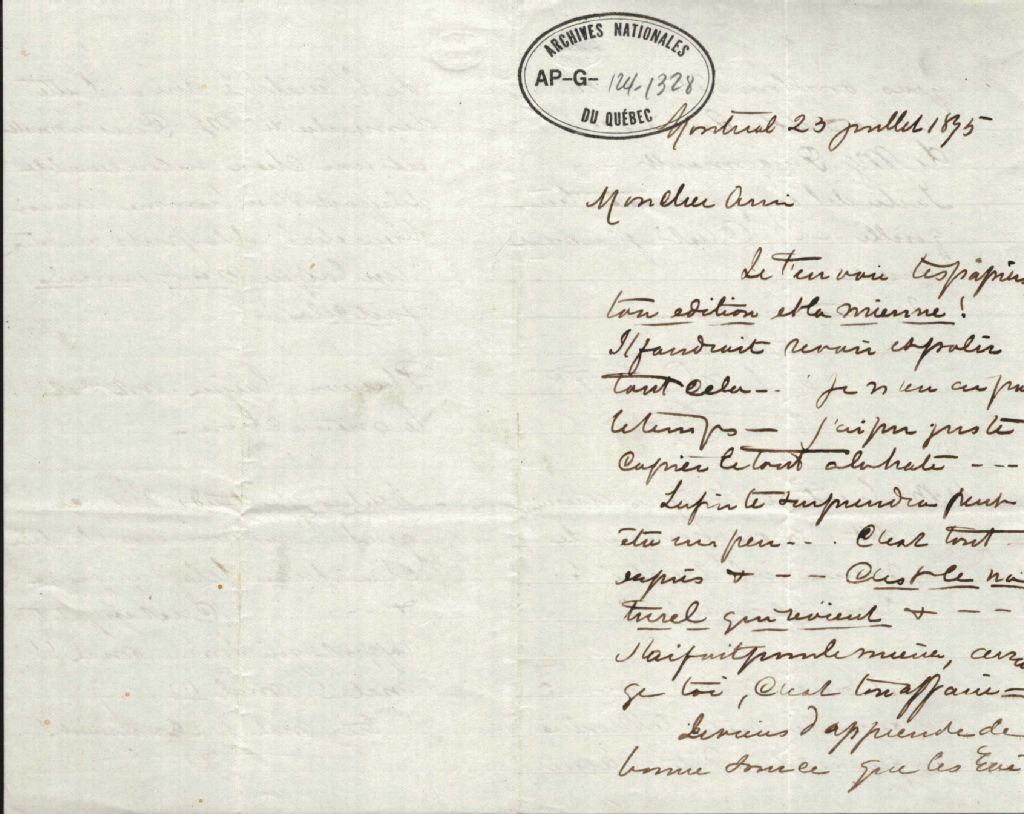 Correspondance du révérend Joseph Clément Séguin au révérend Antoine Labelle et à monseigneur Pinsonnault, 23 juillet 1875-25 mars 1880, Archives nationales à Montréal, Fonds Antoine Labelle, (06M,P774,S1,D544).