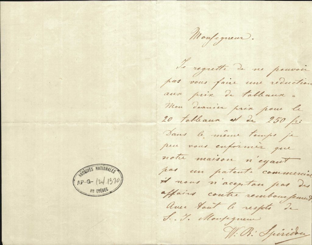 Correspondance de W. R. Spiridou à monseigneur Antoine Labelle, [1890?]-30 juin 1890, Archives nationales à Montréal, Fonds Antoine Labelle, (06M,P774,S1,D562).