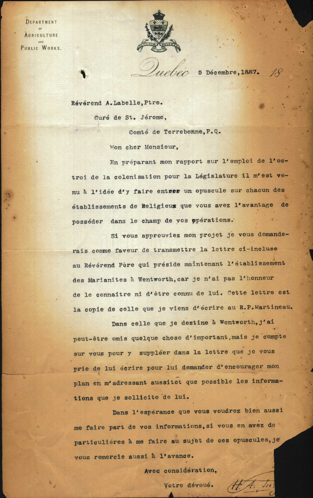 - Correspondance de H. A. Turgeon à monseigneur Antoine Labelle et à Charles Turgeon