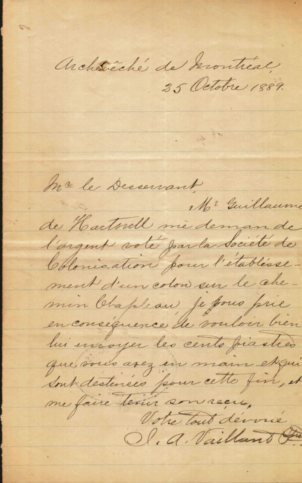 Lettre du révérend J. A. Vaillant au desservant de Saint-Jérôme