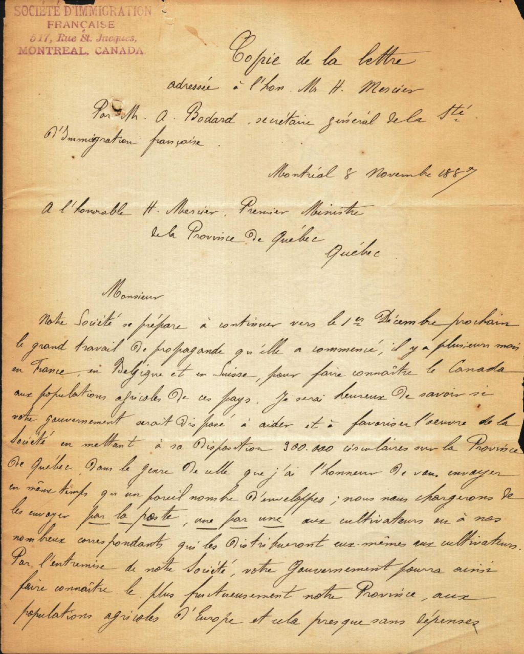 Correspondance de A. Bobard, secrétaire général de la Société d'Immigration française, à l'honorable Honoré Mercier, au révérend Antoine Labelle, à M. Gigault et M. Sylvestre