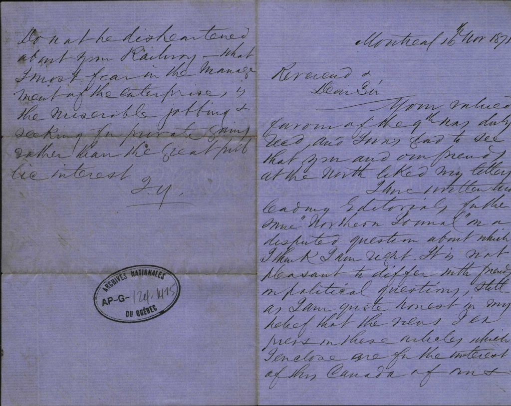 Correspondance de John Young au révérend Antoine Labelle et à Charles Legge, 16 novembre 1871-1 septembre 1876, Archives nationales à Montréal, Fonds Antoine Labelle, (06M,P774,S1,D620).