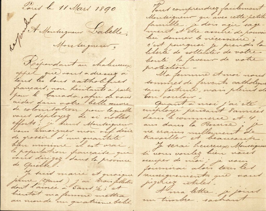 Lettre de Georges Bourbon à monseigneur Antoine Labelle, 11 mars 1890, Archives nationales à Montréal, Fonds Antoine Labelle, (06M,P774,S1,D75).