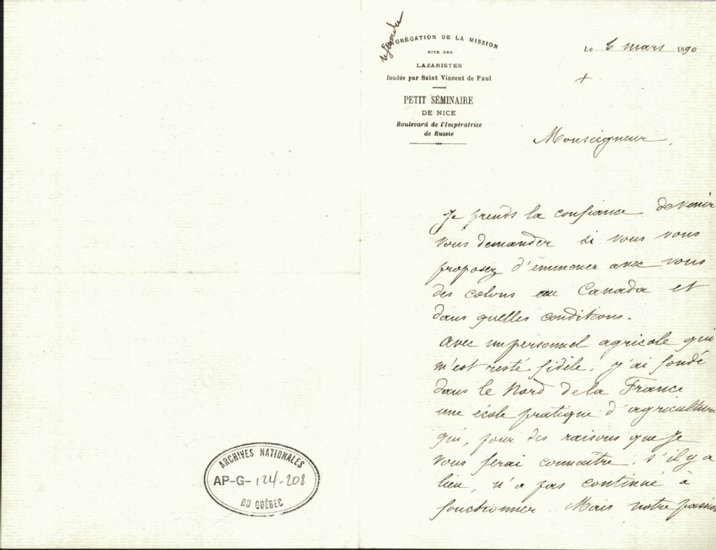 Correspondance du révérend A. Briaux, de la Congrégation de la Mission des Lazaristes, à monseigneur Antoine Labelle, 6 mars 1890-14 mars 1890, Archives nationales à Montréal, Fonds Antoine Labelle, (06M,P774,S1,D81).