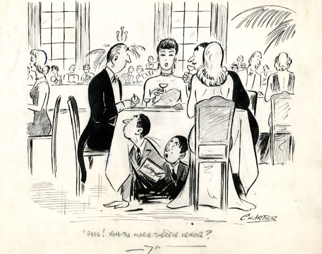 Cette pièce décrit une salle d¿un restaurant élégant, deux couples dînent à une table. Sous la nappe se cachent deux jeunes garçons avec leur livre d¿autographes, [194-]