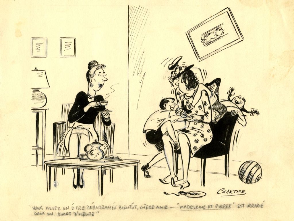 "Vous allez en être débarrassée bientôt, chère amie - "Madeleine et Pierre" est irradié dans un quart d'heure", [194-], Archives nationales à Montréal, Fonds Albert Chartier, (06M,P790,S1,P32), Chartier.