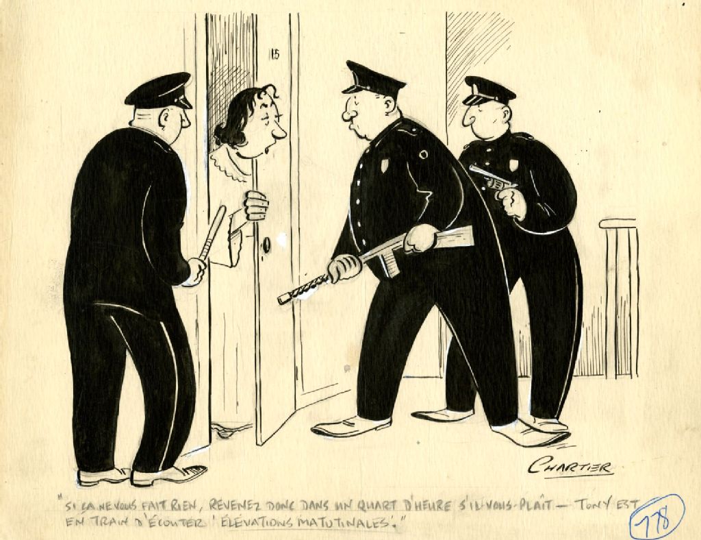 "Si ça ne vous fait rien, revenez donc dans un quart d'heure s'il-vous-plaît - Tony est en train d'écouter "Élévations matutinales"", [194-], Archives nationales à Montréal, Fonds Albert Chartier, (06M,P790,S1,P33), Chartier.