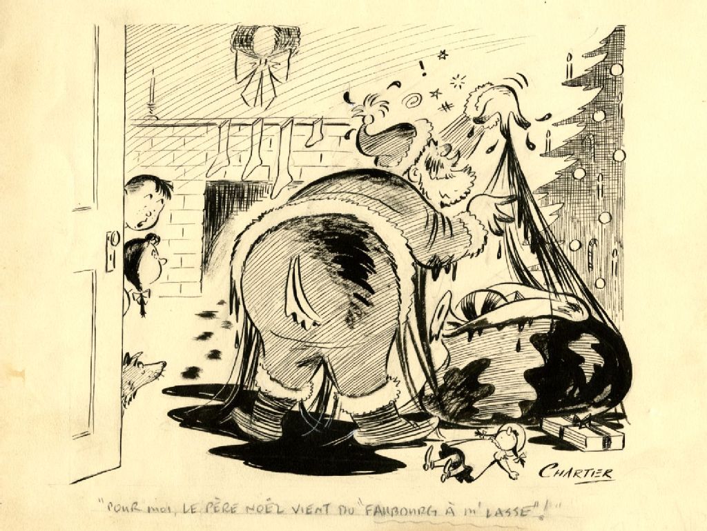 Cette pièce nous présente le père Noël avec son sac de jouets couvert d¿une substance noire et gluante. Deux enfants et un chien regardent la scène et le garçon commente à sa s¿ur, [194-]