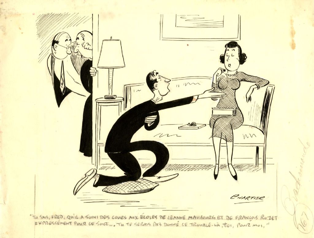 "Tu sais, Fred, qu'il a suivi des cours aux écoles de Jeanne Maubourg et de François Rozet expressément pour ce soir...Tu te serais pas donné ce trouble-là, toi, pour moi", [194-], Archives nationales à Montréal, Fonds Albert Chartier, (06M,P790,S1,P9), Chartier.