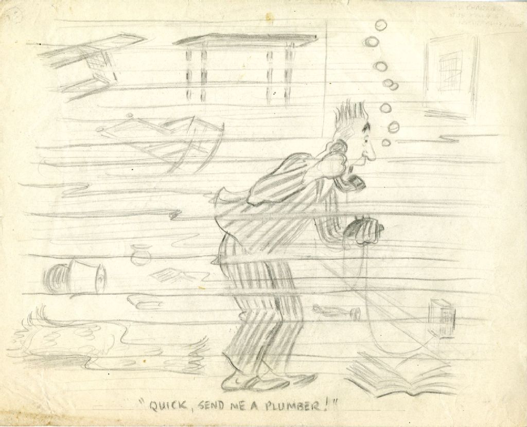 Le dessin montre un homme en pyjamas dans une pièce complètement inondée et qui téléphone en demandant "Quick, send me a plumber!"