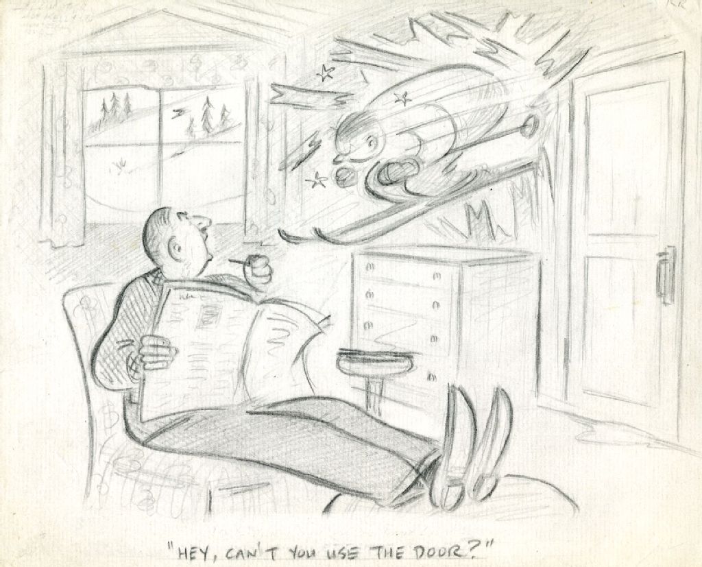 Le dessin montre un homme confortablement assis en train de lire son journal alors qu'un skieur fracasse le mur de sa maison. L'homme dit "Hey, can't you use the door?"